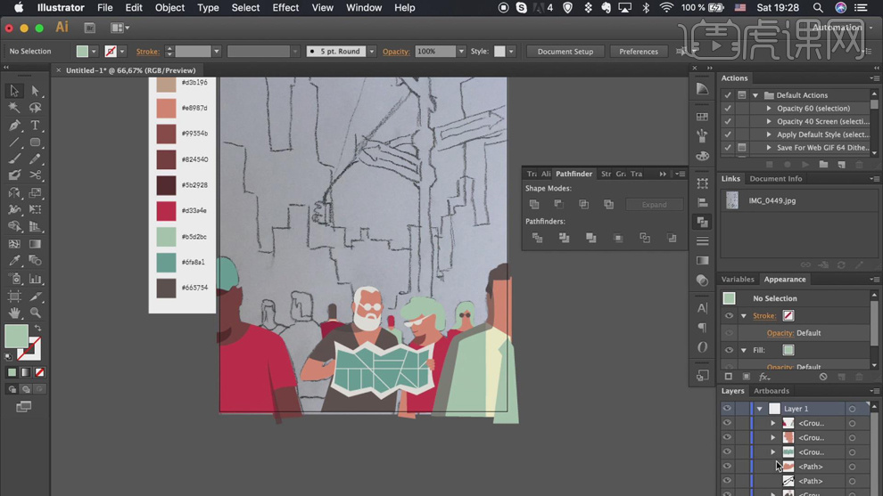 调整草图至画布大小。2、按照草图,利用不异的方式,利用不异的方式绘制残剩的人物以及联系关系元素,按照光影纪律绘制人物明暗区额外形对象,单击【径查找器】-【联集】。调整图层挨次。具体操做如图示。具体显示如图示。按照草图绘制标的目的标元素,【填充】合适的颜色,【打开】AI软件,